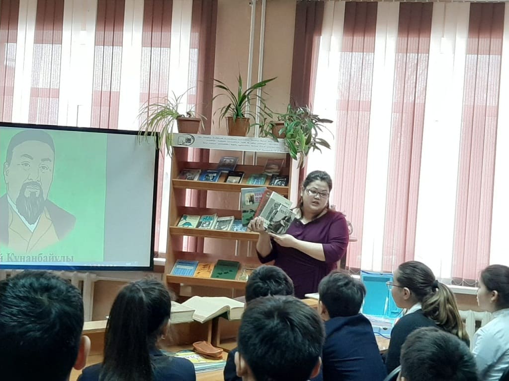 21 января библиотекарь читального зала Зейкенова Жибек приняла участие в круглом столе «Абай – дара, Абай – дана қазақта», посвященном 175-летию казахского просветителя и поэта Абая Кунанбаева. Круглый стол состоялся на базе гимназии №93 для учащихся 7-х классов.