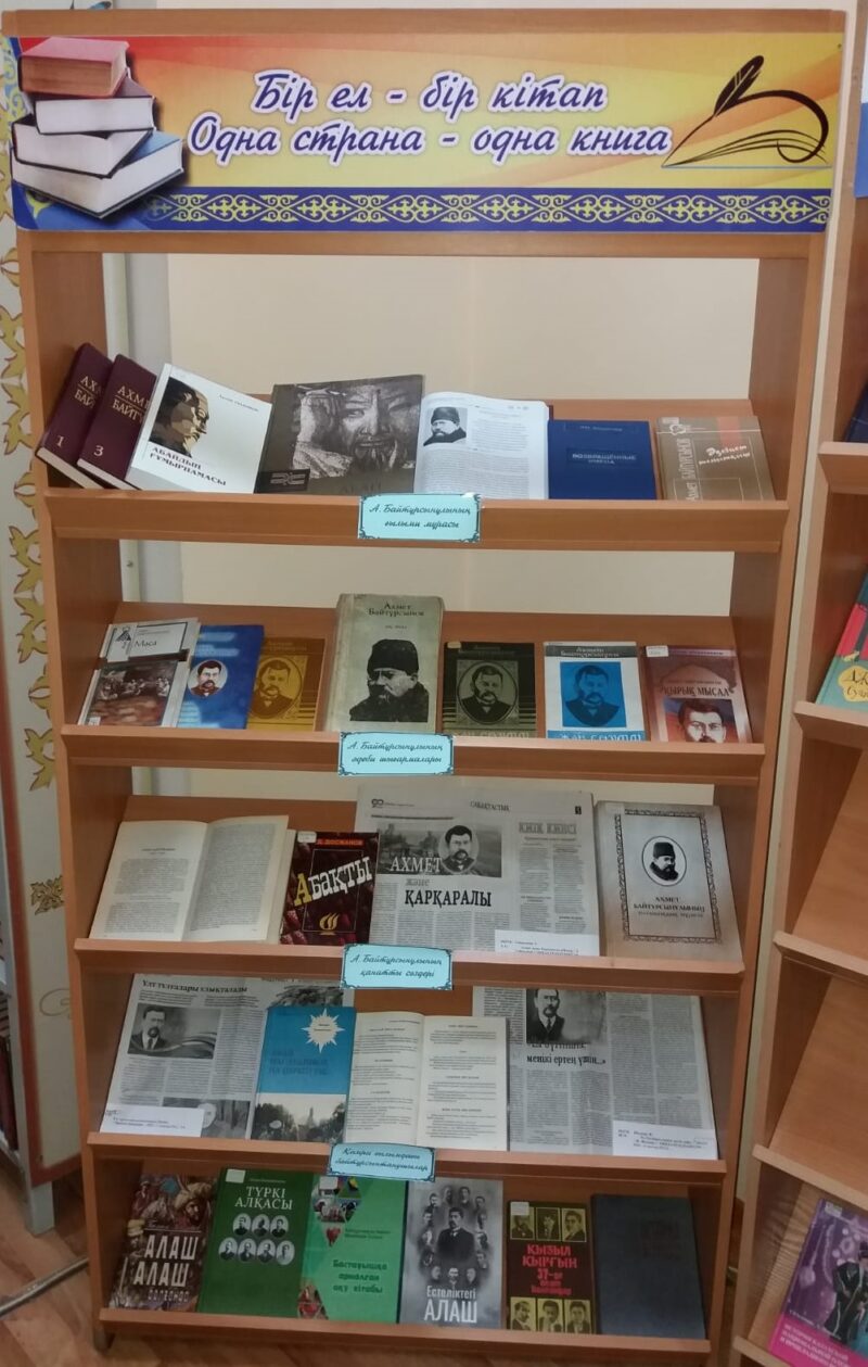 2022 жылы «Бір ел – бір кітап» республикалық акциясы аясында «Алаш» қозғалысының көрнекті өкілі ғалым, ағартушы, ақын, публицист, Ахмет Байтұрсынұлының шығармаларын оқуға таңдалынды. Кітапхананың оқу залында ұлттық жазудың реформаторы қазақ лингвистикасы мен әдебиеттанудың негізін қалаушы А. Байтұрсынұлының шығармаларына арнап кітап көрмесі ұйымдастырылды.