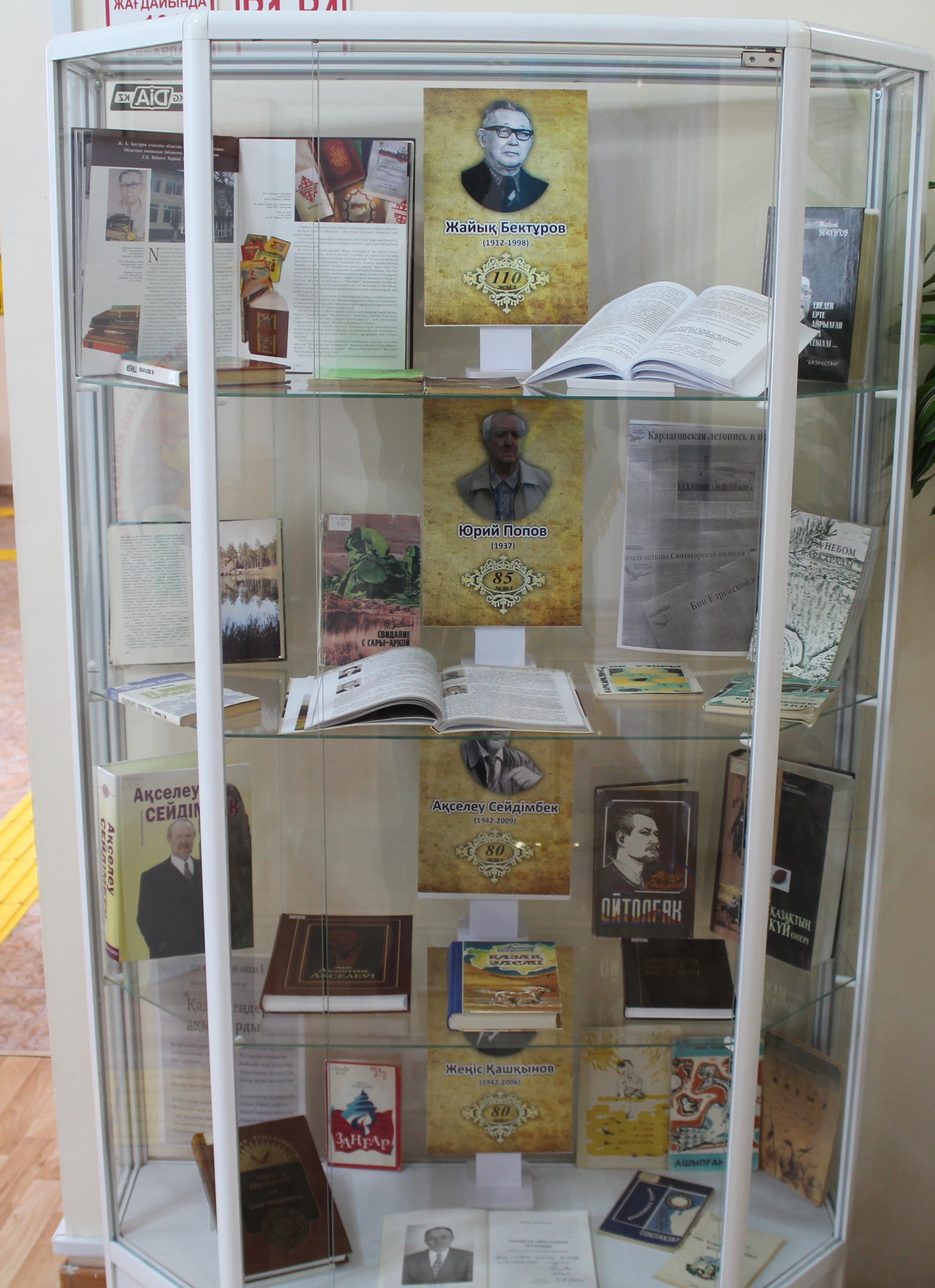 Кітап көрмеге қазақ ақыны, жазушы, аудармашы, зерттеуші Жайық Бектұровтың 110 жылдығына орай «Өткел», «Жол жоралғысы», «Таңба» «Енеден ерте айрылған төл секілді» кітаптары және зерттеуші, натуралист Юрий Поповтың туғанына 85 жыл толуына байланысты «Қарқаралы», «Их помнит Сарыарка», «Свидание с Сары-Аркой», «Каркаралинские узоры», «Каркаралинские находки», «Под небом Каркаралы» т.б басылымдар қойылды. Жазушы, әдебиет зерттеушісі ғалым Ақселеу Сейдімбектің туғанына 80 жыл толуына орай «Қазақтың күй өнері», «Алаштың аяулы Ақселеуі», «Ойтолғақ», «Қазақ әлемі», «Алаштың Ақселеуі» және Ақтоғай ауданының құрметті азаматы, ақын, қаламгер Жеңіс Қашқыновтың туғанына 80 жыл толуына орай «Ашылған сыр», «Ағаны жұрт мақтайды», «Ақжолтай Ағыбай батыр», «Он тоғызыншы биіктік», «Соқпақтар», «Заңғар» атты кітаптары қойылды.