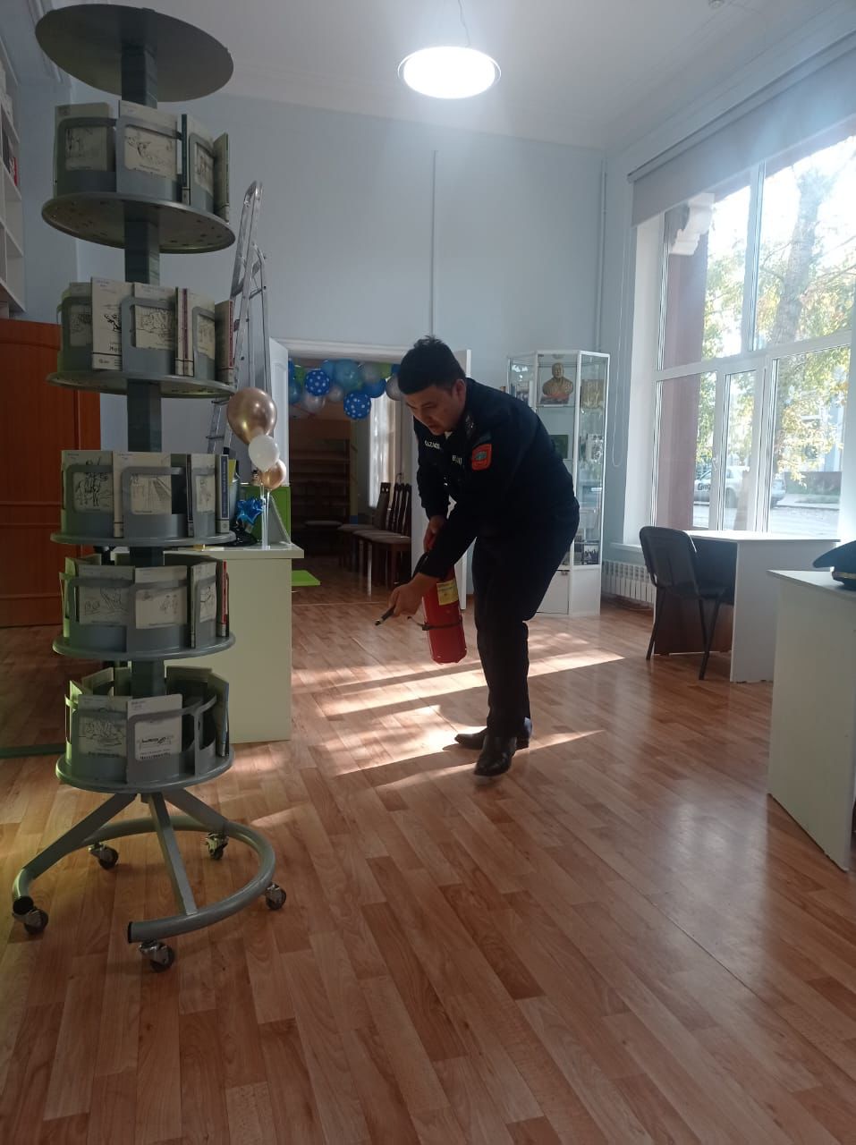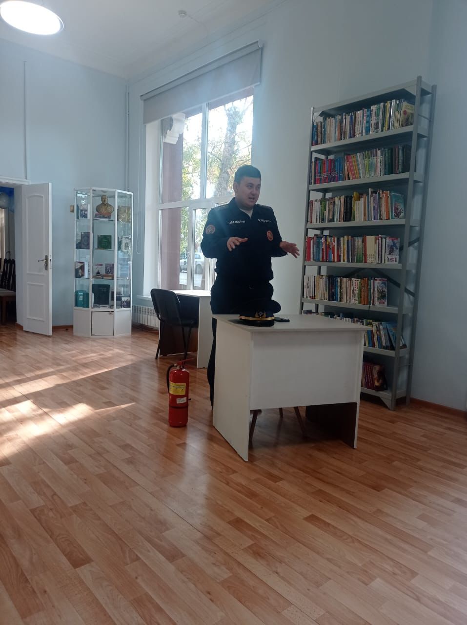 Ақпараттық нұсқаулықты Қарағанды қаласының ТЖБ бас маманы, азаматтық қорғау капитаны Сағатаев Дамир Нұрланұлы жүргізді. Кітапхана қызметкерлері мекемеде өрт қауіпсіздігі ережелерін сақтау туралы әңгімелесіп, алғашқы өрт сөндіру құралдарын пайдалану ережелерін түсіндіріп өтті.
