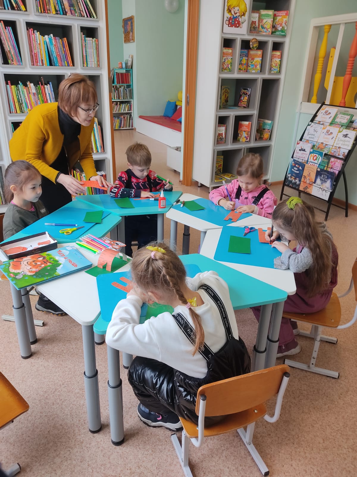 «Шуақ» шығармашылық студиясының кезекті сабағында балалар «Жолбарыс пен тышқан» ертегісі бойынша жолбарыстың көлемді аппликациясын жасады.