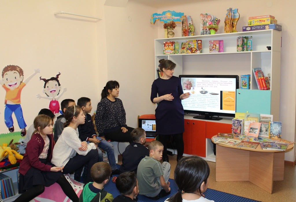 Міне, біз де ақпараттық – слайдтық таныстырылым мен кітап көрмесінің шолуы арқылы Е.Пономаренко, Н.Инжевская, Н.Ключенко, Е.Зейферт, Д.Джумагельдиновалар туралы әңгімелеп және шығармаларынан үзінділер оқи отырып, балаларды Қарағанды қаласының балалар жазушыларымен таныстырдық.