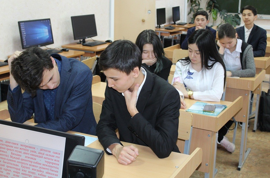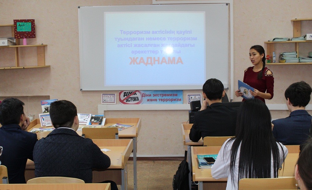 Оқушылар назарына «Терроризмсіз болашақ» атты презентация, Қазақстандағы лаңкестік туралы бейнеролик және «Терроризм актісінің қаупі туынадаған немесе терроризм актісі жасалған жағдайдағы әрекеттер» туралы жаднама көрсетілді. Аталмыш шара соңында тақырыпқа сай ұйымдастырылған «Діни экстремизм және терроризм» атты тақырыптық сөреге шолу жасалды.