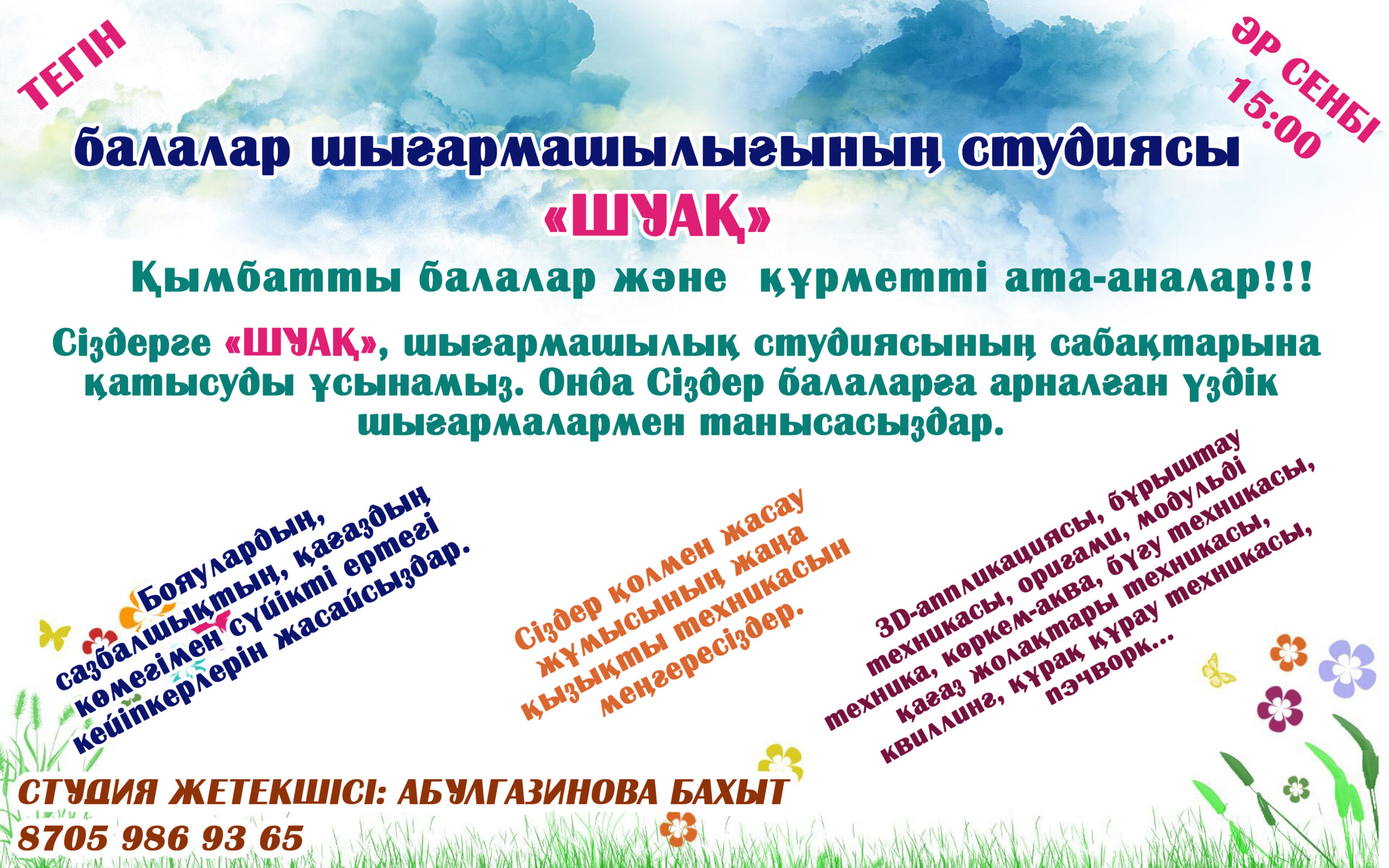 2005 жылдан бастап мектепке дейінгі және кіші мектеп жасындағы балаларға қызмет көрсету бөлімінде «Шуақ» балалар шығармашылық студиясының сабақтары өтуде.