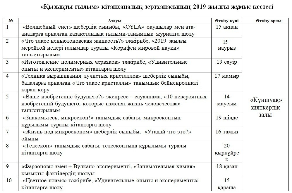 «Қызықты ғылым» жұмыс кестесі