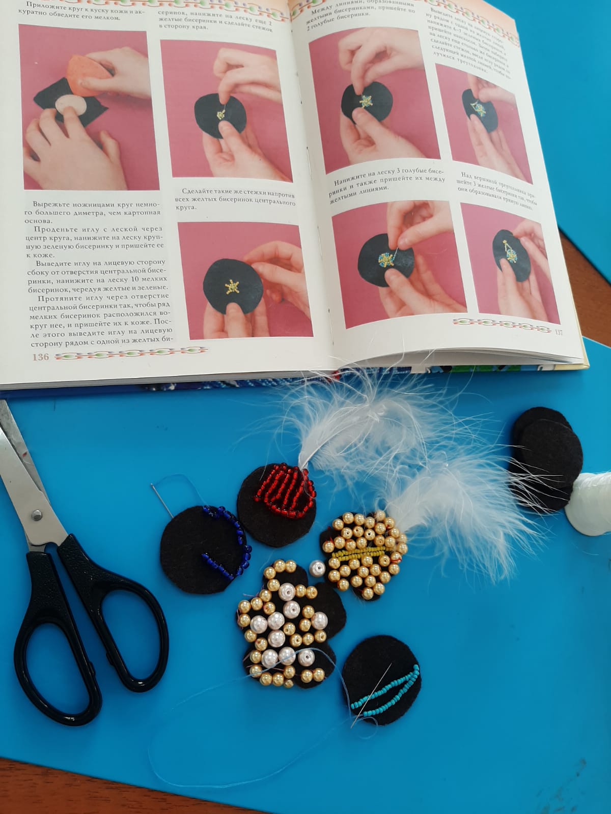 На очередном занятии арт-мастерской девочки продолжили собирать фетровую брошку, используя фетр, нитки, иголку, ножницы, специальную застежку для булавок и бисер.