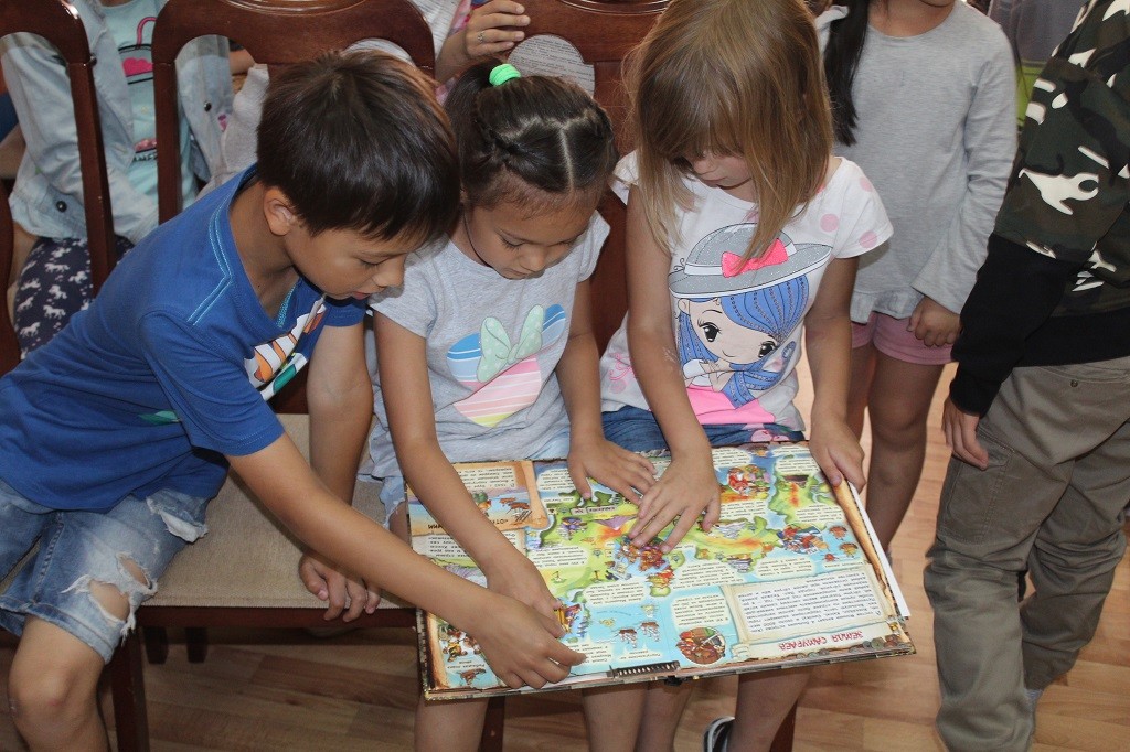 Вниманию ребят были представлены новинки интерактивных книг серии «Загадочный мир прошлого» — «Рыцари», «Фараоны», «Самураи», «Викинги», виртуальные книги автора Абая Али, где с помощью мобильного приложения оживают древние вымершие животные и птицы, энциклопедия полезных знаний и навыков «Как подготовиться к приключениям» издательства «Фолиант», книга с деталями создания американских горок «Наука на виражах», интерактивная книга — эпоха Артура Конан Дойля «Приключения Шерлока Холмса».