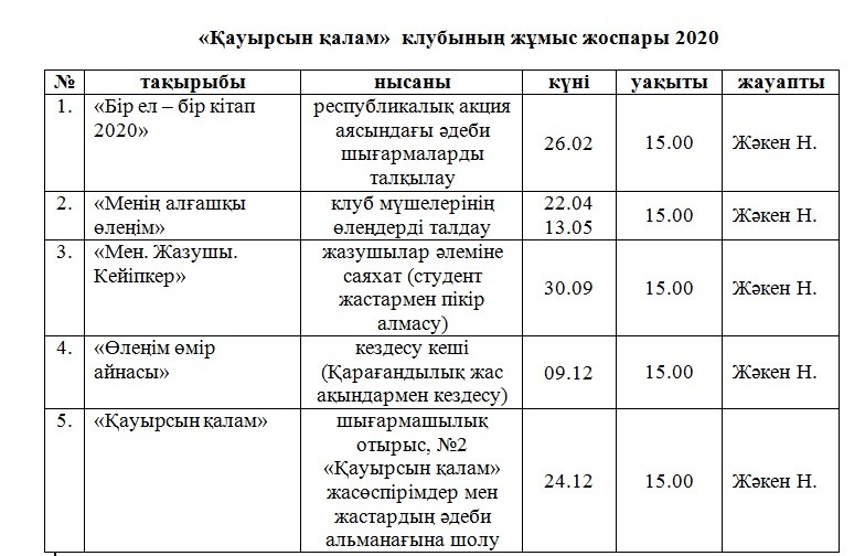 «Қауырсын қалам» әдеби клубының ұйымдастыруымен өтіп жатқан отырыстарды кітапхананың ресми сайтынан және instagram желісіндегі қауырсын қалам парақшасынан көре аласыздар.