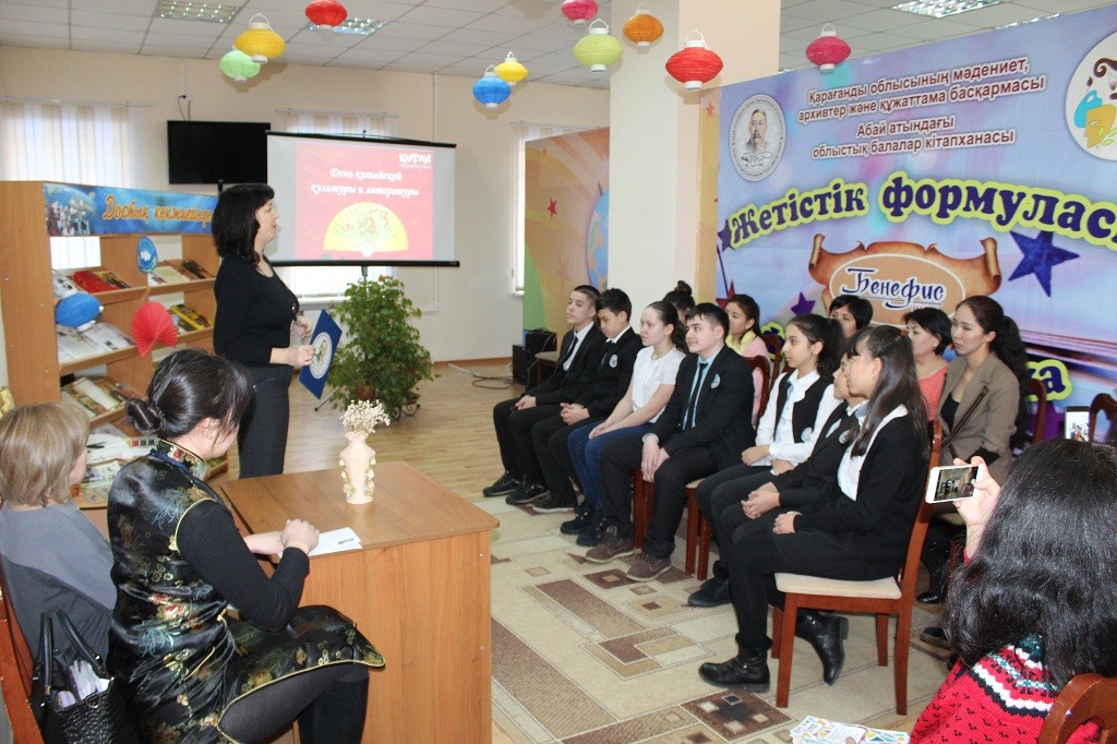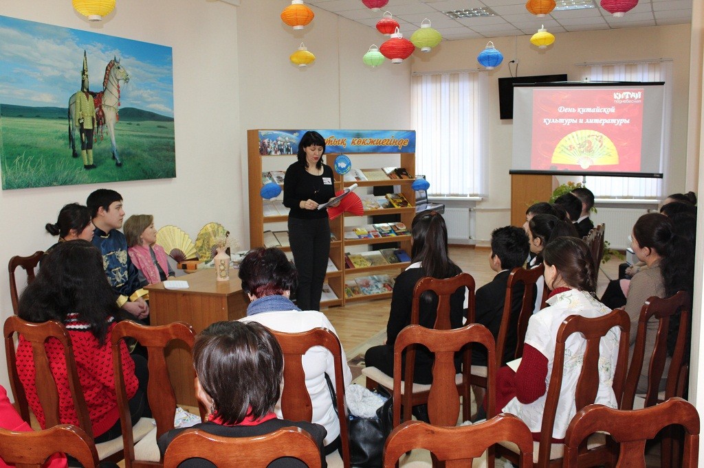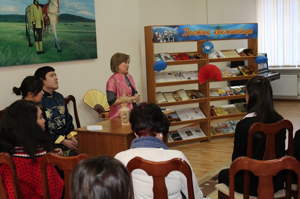 Соприкоснуться с культурой китайского народа читателям библиотеки помогли представители ОО «Китайский национально-культурный центр «Дружба» студенты 4 курса факультета «Международные отношения» КарГУ Кочиеру Светлана, Шабакбаев Адиль и доцент кафедры всемирной истории и международных отношений Досова Бибигуль Аралбаевна, а также руководитель курса изучения китайского языка при Доме талантов «Maison des talents» Аязбай Улпан Толеукызы.