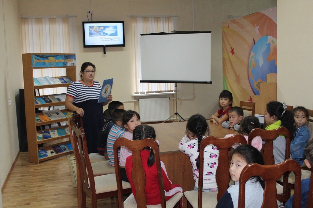 Используя слайд-презентацию, библиотекарь Зейкенова Ж. рассказала детям об одном из самых значимых государственных праздников; об основных положениях Конституции; о правах граждан.