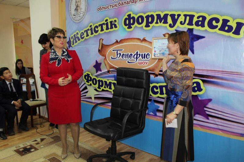 Куспекова Дильназ, ученица 9 «Ә» класса гимназии №39 имени М. Жумабаева, из рук главной героини бенефис-шоу получила подарок – энциклопедию «Қарағанды. Қарағанды облысы» за лучший вопрос от аудитории.