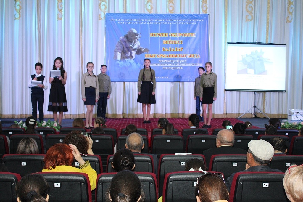 В связи с этим наша библиотека провела областной конкурс творческих работ «Образ Нуркена Абдирова в творчестве детей» среди школьников Карагандинской области.