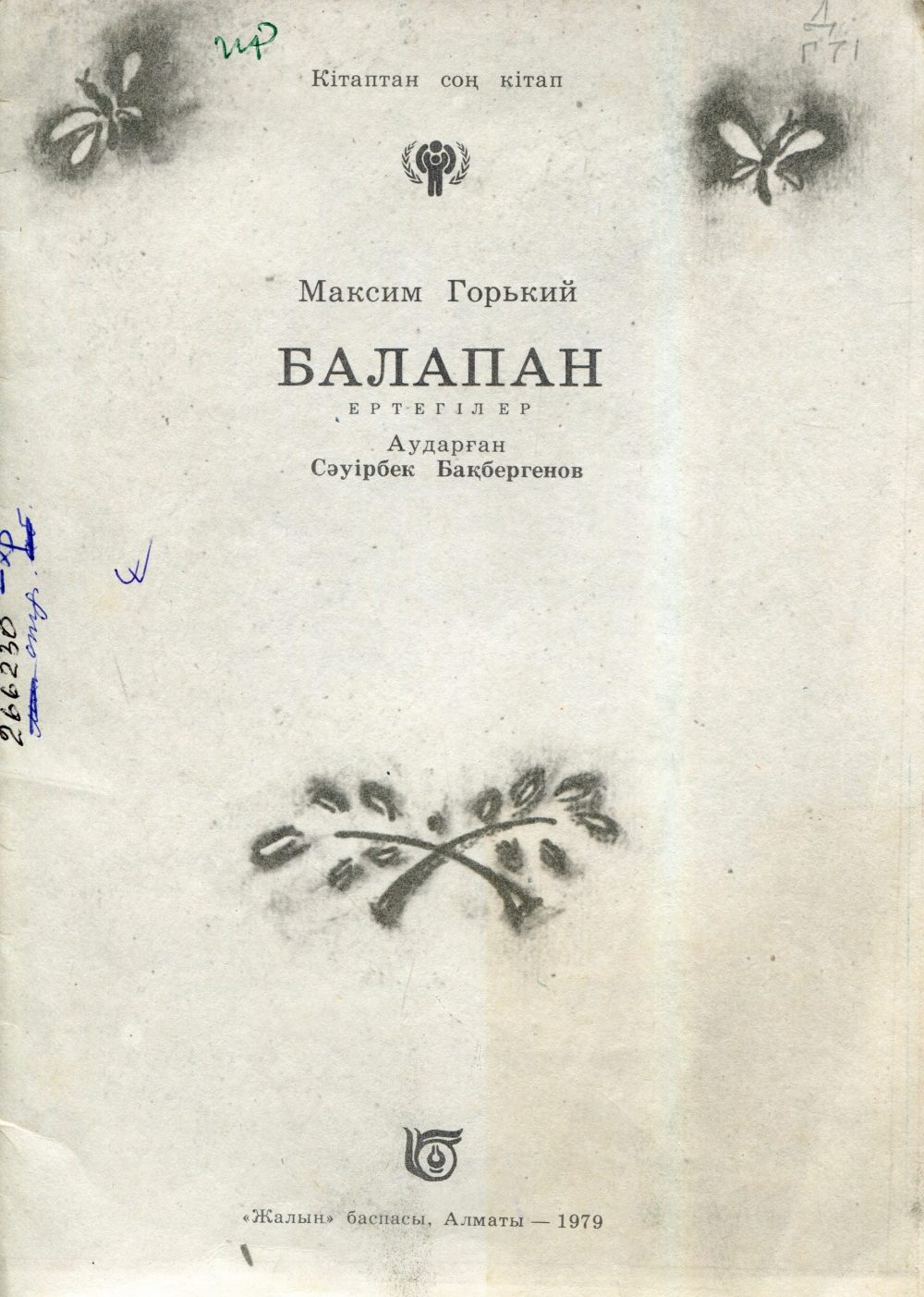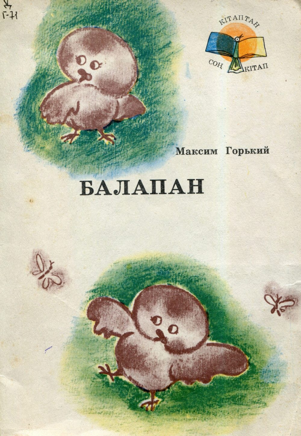 Горький, Максим. Балапан [Мәтін] : ертегілер / М. Горький ; пер. С. Бақбергенов ; худож.: Т. Гонова, Р. Ахметов. — Алматы : Жазушы, 1979. — 19 б : сур. — (Кітаптан соң кітап)