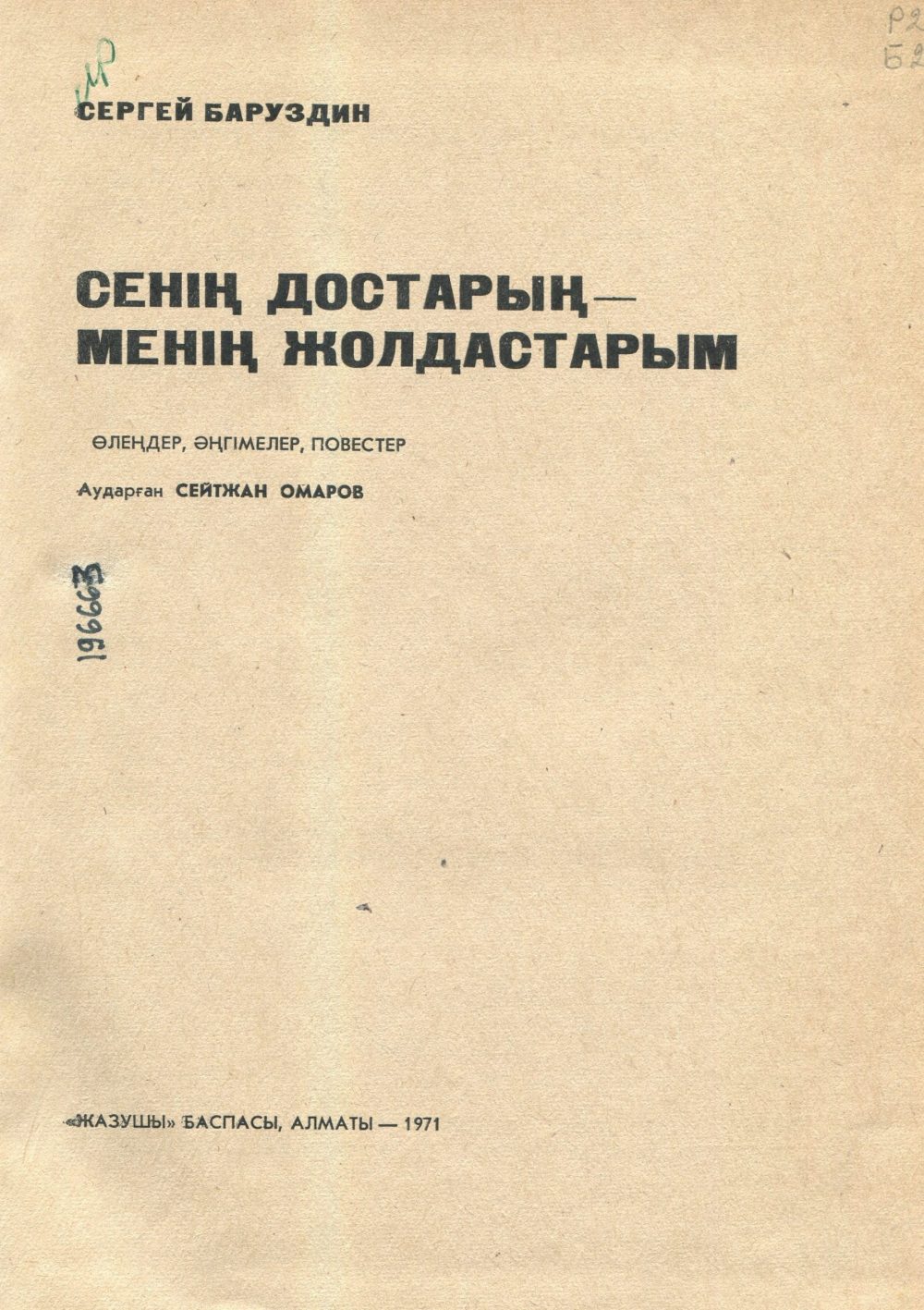 Баруздин, Сергей. Сенің достарың — менің жолдастарым [Мәтін] : өлеңдер, әңгімелер, повестер / С. Баруздин ; ауд. С. Омаров. — Алматы : Жазушы, 1971. — 223 б. : сур. — 0.53 р.