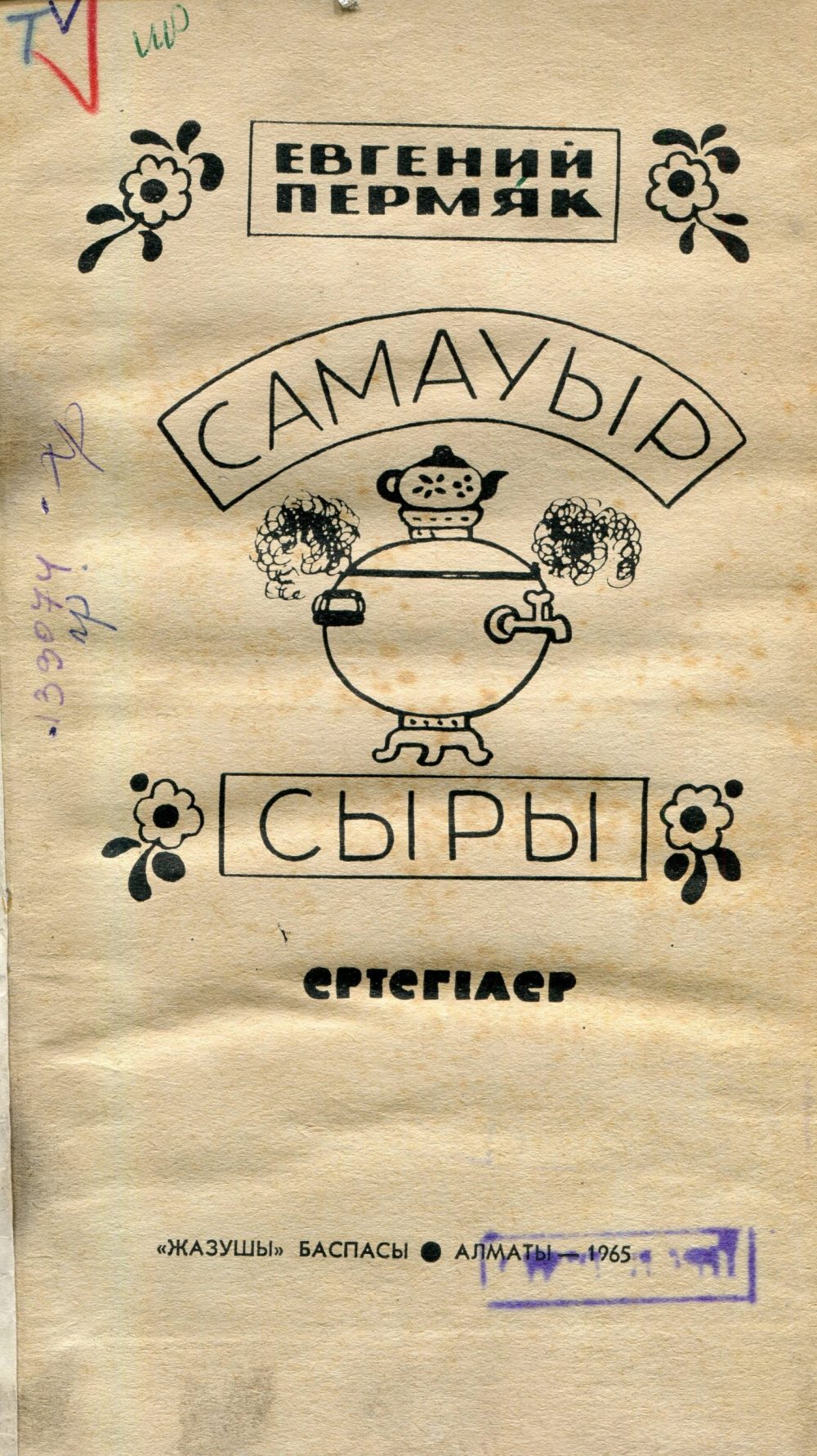 Пермяк, Евгений. Самауыр сыры [Мәтін] : ертегілер / Е. Пермяк ; ауд. Ж. Бектенов ; сур. Ғ. Әлімов. — Алматы : Жазушы, 1965. — 100 б. : ил. — 0.14 р.