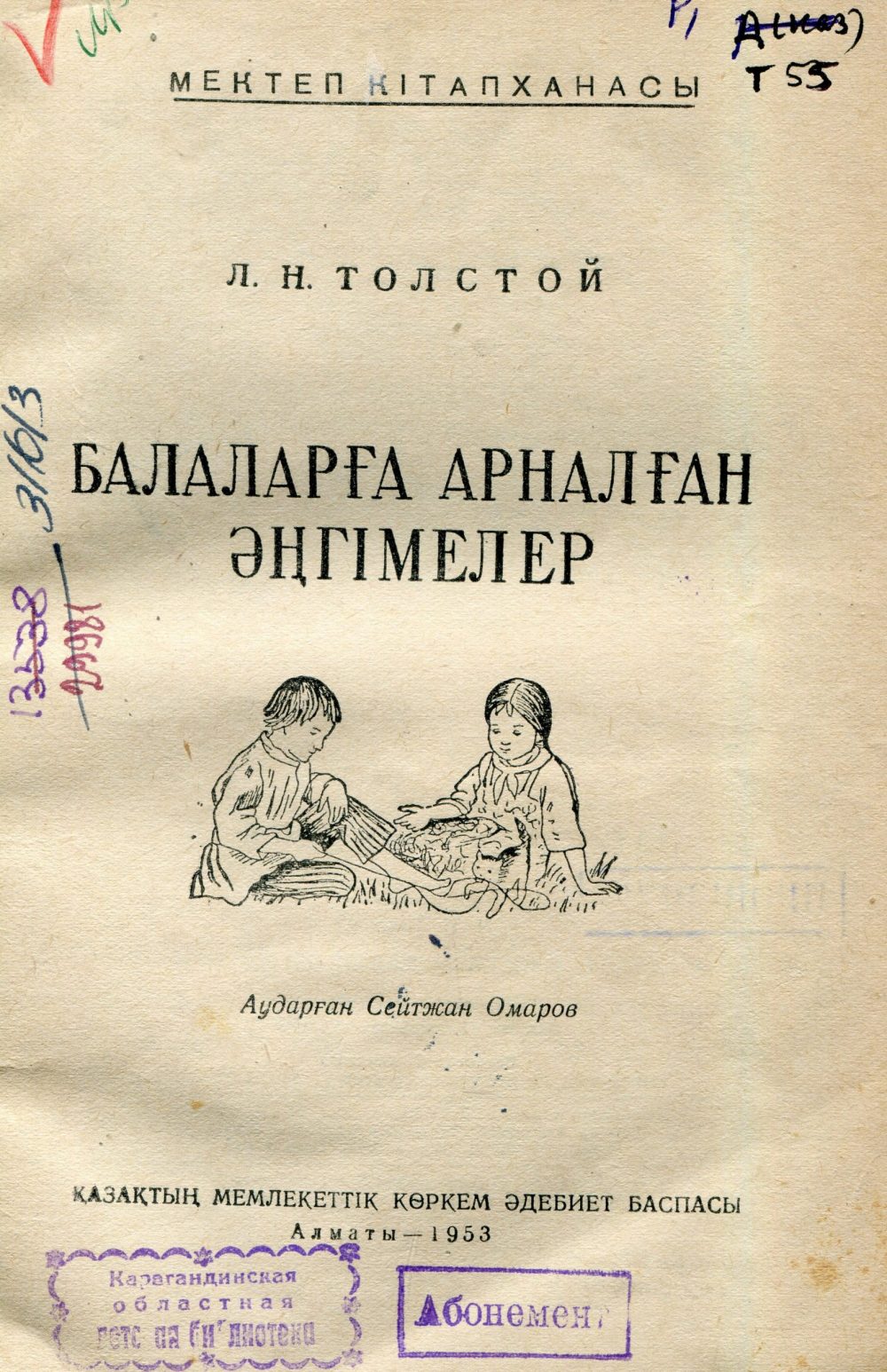 Толстой, Л. Н. Балаларға арналған әңгімелер [Мәтін] / Л. Н. Толстой ; ауд. С. Омаров. — Алматы : Қазақтың мемлекеттік көркем әдебиет баспасы, 1953. — 80 б. : сур. — 0.20 р.