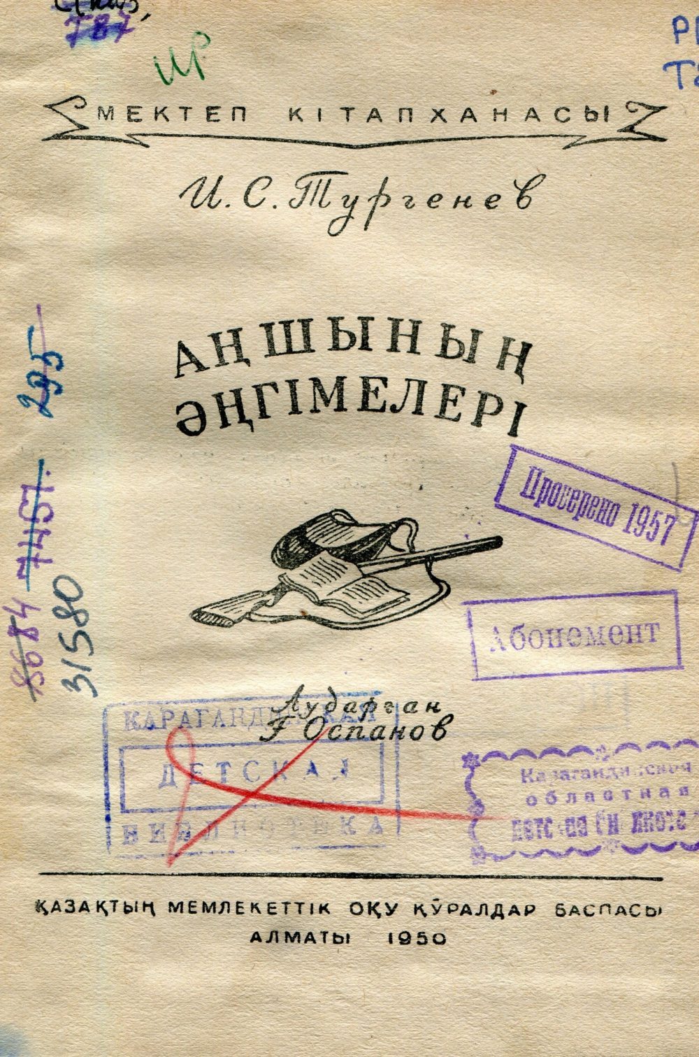 Тургенев, И. С. Аңшының әңгімелері [Мәтін]/ И. С. Тургенев ; ауд. Ғ. Оспанов . — Алматы : Қазақтың мемлекеттік оқу- құралдар баспасы, 1950. — 127 б. : сур. — (Мектеп кітапханасы). — 0.35 р.
