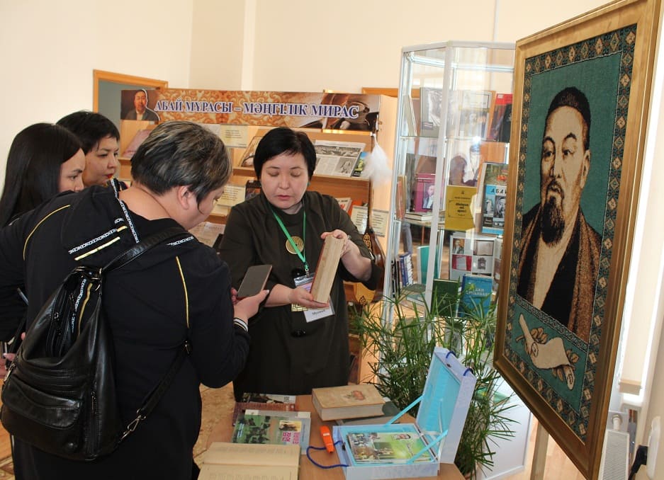 Библиотекари представили вниманию присутствующих книги из раритетного фонда библиотеки — роман «Абай» М.Ауэзова 1948г. издания в переводе на русский язык Л.Соболева, книгу А.Кунанбаева «Избранное» 1951 года издания, книгу Абай (Ибраһим) Құнанбаев «Шығармаларының екі томдық толық жыйнағы» 1957 г. издания, сборник А.Кунанбаева «Стихотворения, поэмы, проза» 1954 года издания, сборник А.Пушкина «Таңдамалы шығармалары» 1949 года издания с переводами Абая отрыков из романа «Евгений Онегин» — «Онегиннің сипаты», «Татьянаның Онегинге жазған хаты» и др. Интерактивная книга для детей о творчестве поэта «Абайтану әліппесі», выставленная на выставке позволит не только прочитать произведения великого поэта, но прослушать их с помощью интерактивной ручки. А с помощью компьютера пользователи смогут посмотреть документальные и художественные фильмы об Абае, прослушать песни Абая из антологии «1000 казахских традиционных песен».