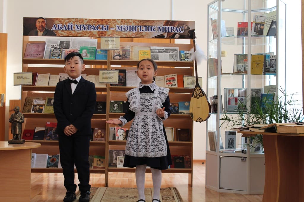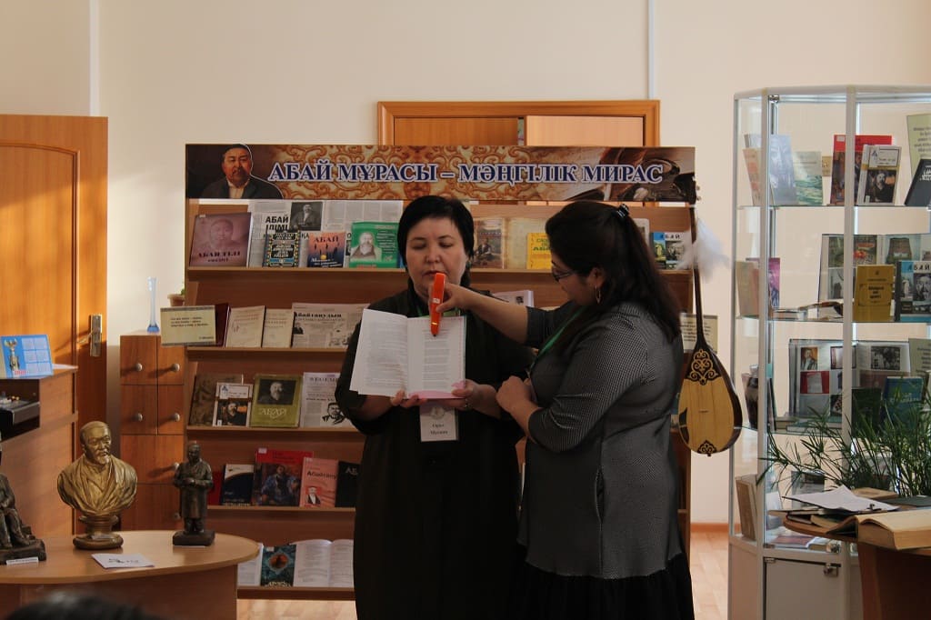 Для читателей и пользователей библиотеки в читальном зале в присутствии учеников 7-класса специализированной школы-интерната для одаренных детей Мурагер, читателей и гостей библиотеки состоялась презентация лучших изданий произведений Абая Кунанбаева на различных носителях – книжных и электронных, произведения искусства и прикладного творчества. На открытии выставки прозвучали стихи Абая в исполнении читателей библиотеки – Владимиркызы Айсулу и Болатбекова Магжана.