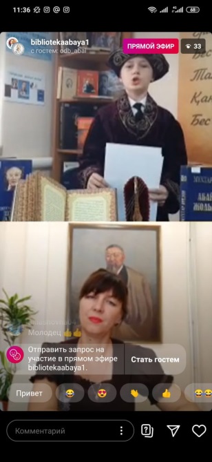 В рамках празднования 175-летия со дня рождения великого казахского поэта и просветителя Абая Кунанбаева 12 августа на странице https://www.instagram.com/odb_abai состоялся прямой эфир с Городской библиотекой №1 имени Абая г. Актобе. Библиотекари поделились информацией о своих библиотеках, рассказали о проведенных мероприятиях, посвященных творчеству Абая Кунанбаева, и представили вниманию читателей редкие книги библиотечного фонда.